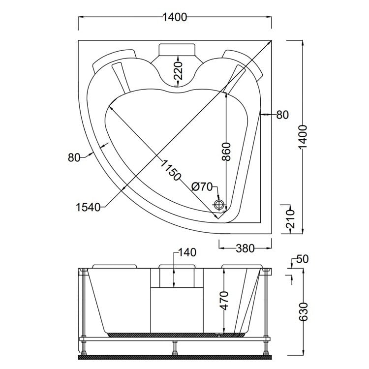 140 X 140 X 60H. ÇİFT KİŞİLİK KÜVET